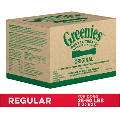 Contains four (4) 18 oz. bags (totaling 72 oz.) of GREENIES Original Regular Size Natural Dental Dog Treats; Natural Dog Treats Plus Vitamins, Minerals, and Other Nutrients