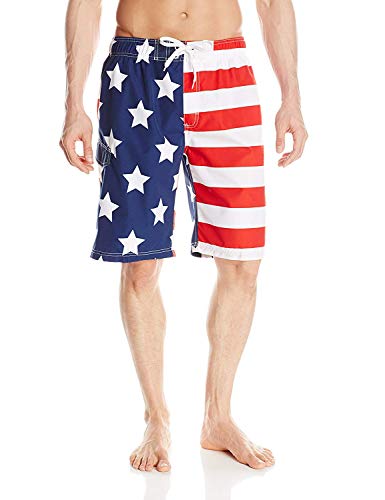 American flag swim trunks in UPF 50+ quick-dry microfiber featuring contrast stitching and reverse stars-and-stripes panels