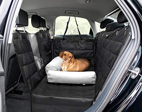 CUSTOMIZABLE COMFORT – Ideal for dogs that get anxious in the car. Create a safe and comfortable cushioned bed with 2 adjustable comfy pillows, and 4 removable covers (2 black and 2 grey). Bolster pillows can be configured in any position with their easy adjust velcro bases. A breathable mesh front window provides airflow and visibility for your dog. Side panels comfortably protect car door interiors and the multi-style adjustable footwell allows for personalized travel.