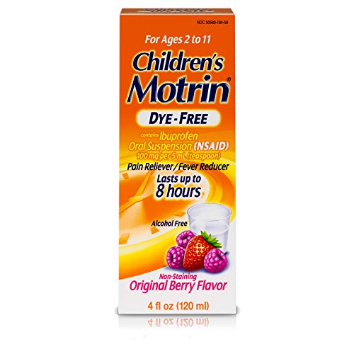 4-fluid ounces of Children’s Motrin Oral Suspension Liquid Medicine with Ibuprofen in a dye-free berry flavor to help temporarily reduce fever and relieve pain due to the common cold & flu