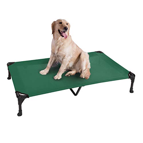 Material: Textilene Mesh and Powder-Coated Steel. Size: 49″x33″x9″ (125x83x22.5 cm). Can hold a maximum weight of 150 pounds (68kg); Suitable for a normal adult German Shepherd, Golden Retriever, Akita, Husky etc.