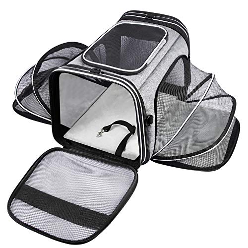 4-Ways Expansions:After expanding 4 sides by unzip the zippers, this expandable pet carrier will be more spacious for your cats or dogs to stay/move aroud/stretch out/nap in it,and it reduces the anxiety of confinement. The front expansion can be opened as an entrance after unzipped.By the way,the 2 side entrances have been enlarged, which is more convenient for your pet to get in/out or play in it without getting hurt.