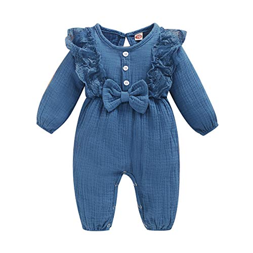 Fashion Style:long sleeve baby romper with lace ruffle sleeve, elastic waist with bow front,make your baby more adorable.Snap leg openings for easy diaper changes+ button neckline opening for easy dressing.