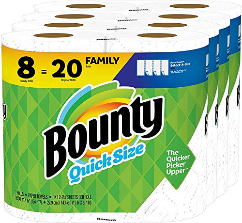 Pack contains 8 Family Rolls of Bounty Quick Size paper towels, equal to 20 Regular Rolls