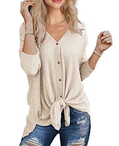 Features: Waffle knitted blouse with button down design,Sexy V Neck,Long sleeve tunic tops, Curved hemline, Tie Front Hem design, Loose fit Bat Wing Plain Shirts