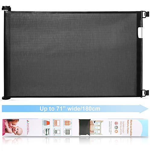 👶【Extra Wide Retractable Baby Gate 】 This retractable baby gate for stairs extends up to 71″ wide and is 34″ tall; Can be installed at top and bottom of Stair, Doorways, Hallways, Deck, Banister, Indoor and Outdoor Use; Mesh can be completely retracted away when not in use, saving you space.